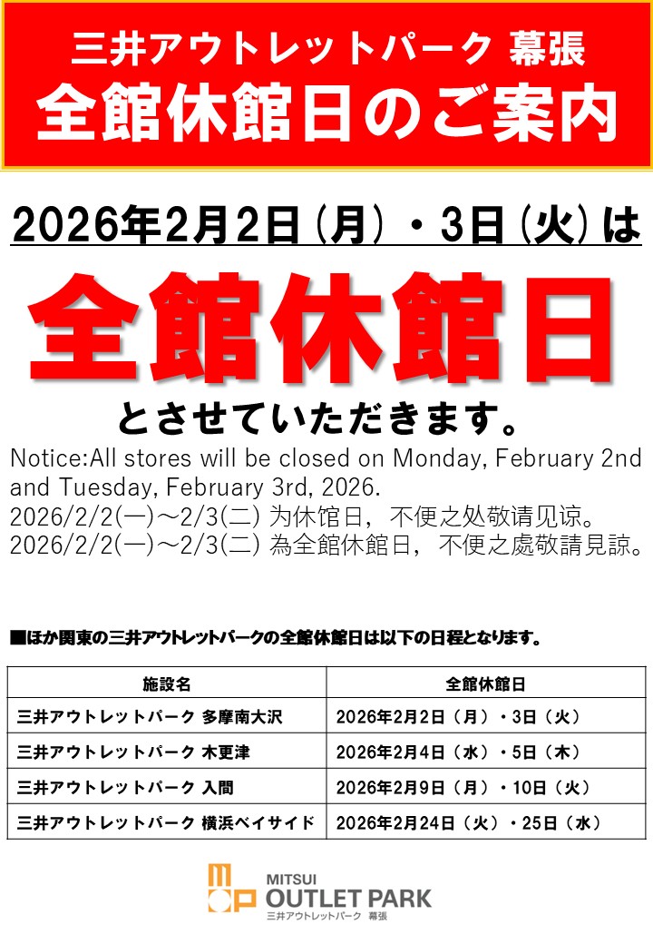 *Other MITSUI OUTLET PARK in the Kanto region will be Closed on the following dates.