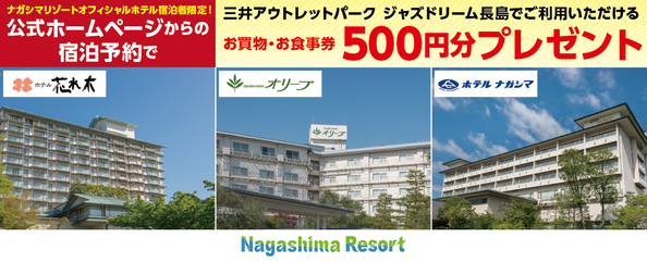 Exclusively for those who make a reservation for the designated dates through the Nagashima Resort official website, we will give you a 500 yen shopping and dining voucher to use at MITSUI OUTLET PARK JAZZ DREAM NAGASHIMA!