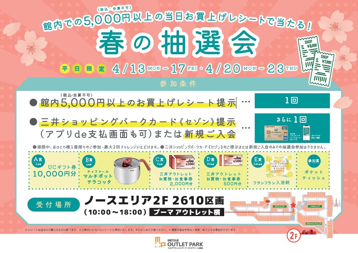 During the campaign period, you can win a prize with a receipt showing a purchase of 5,000 yen (tax included, receipts cannot be combined) or more made inside the building on the same day!