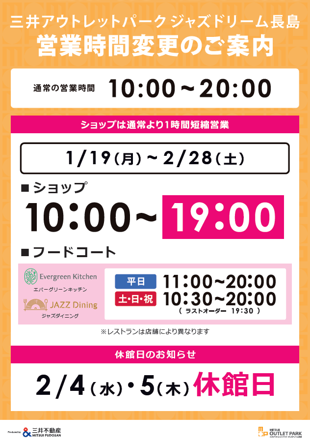 Thank you for always using MITSUI OUTLET PARK JAZZ DREAM NAGASHIMA.