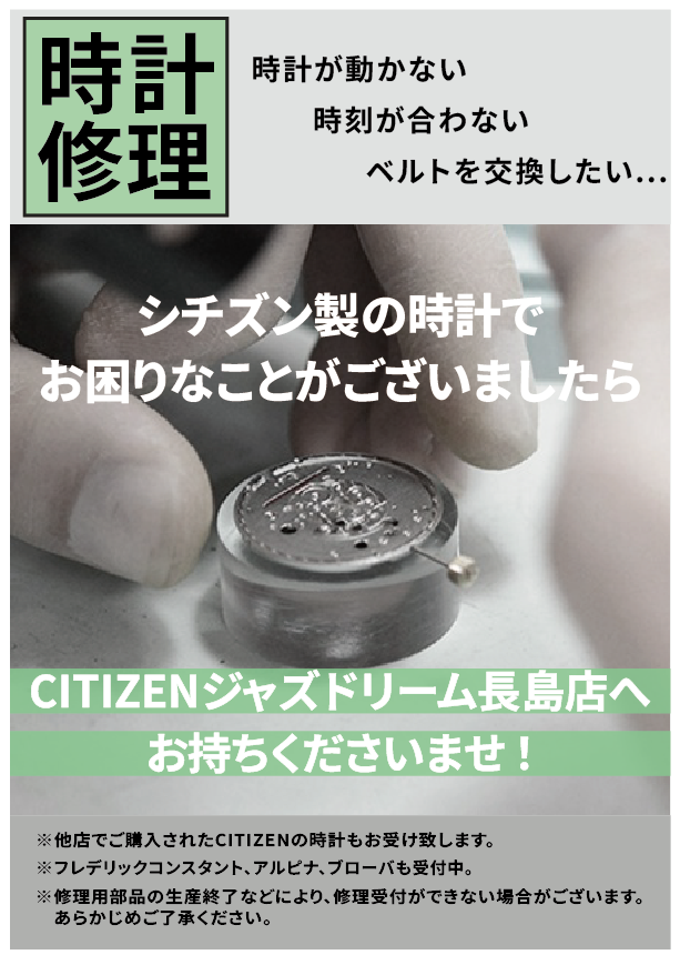We accept repairs for CITIZEN watches at CITIZEN JAZZ DREAM NAGASHIMA store.