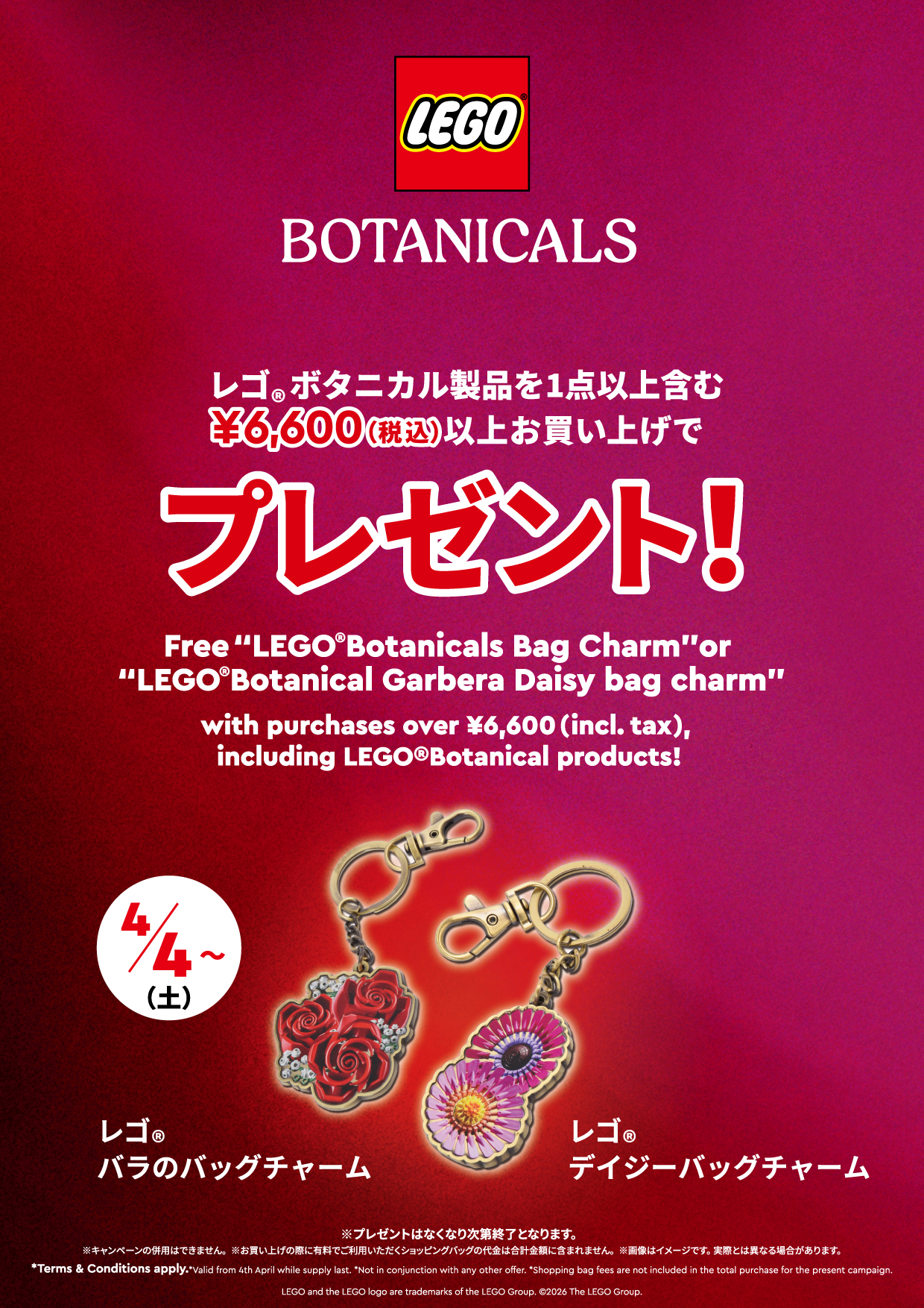 - Get a free LEGO® Botanical Bag charm with any purchase of 6,600 yen (tax included) or more, including LEGO Botanical products!