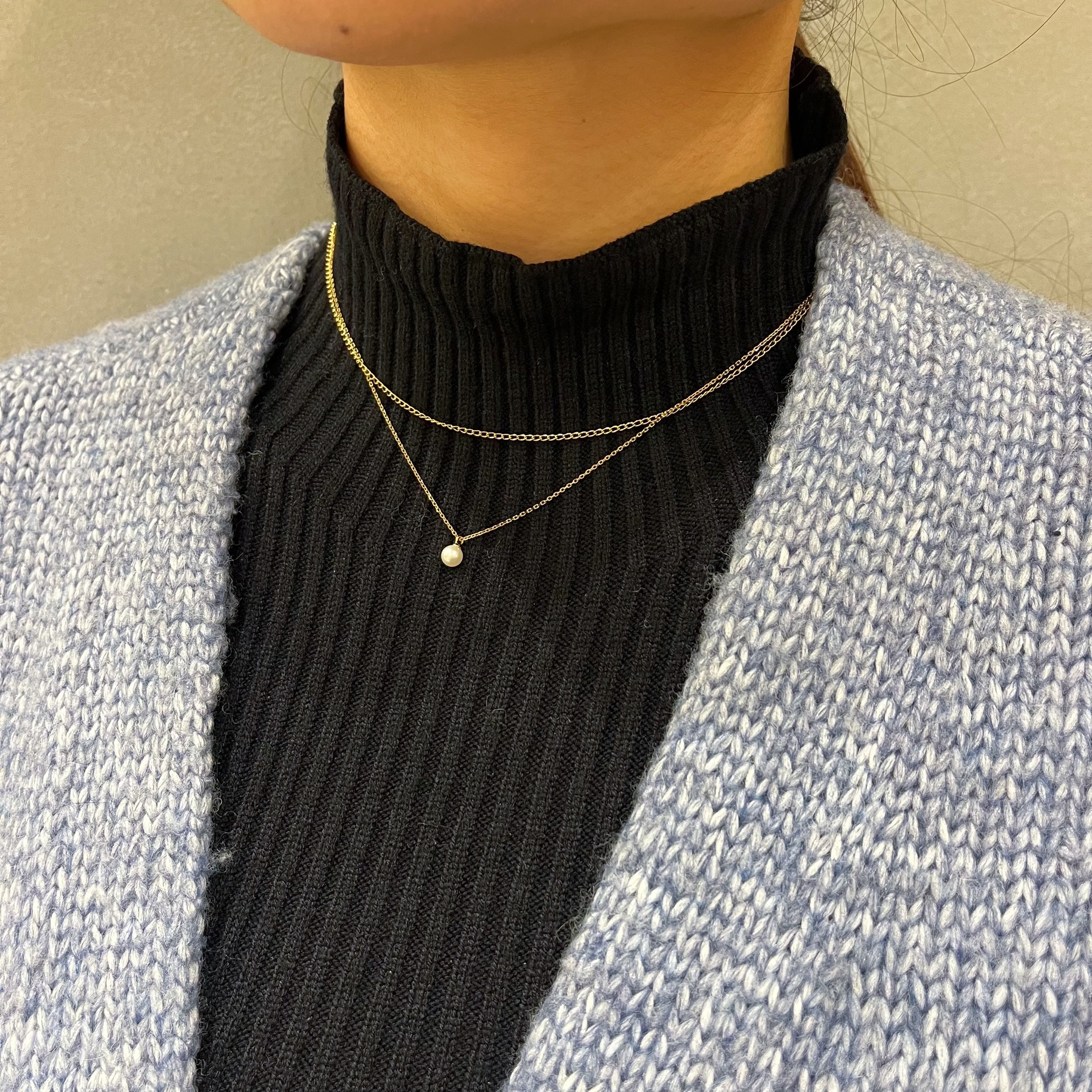 Two chains with different expressions are connected together to add a touch of glamour to the décolleté. A single pearl stands out subtly.