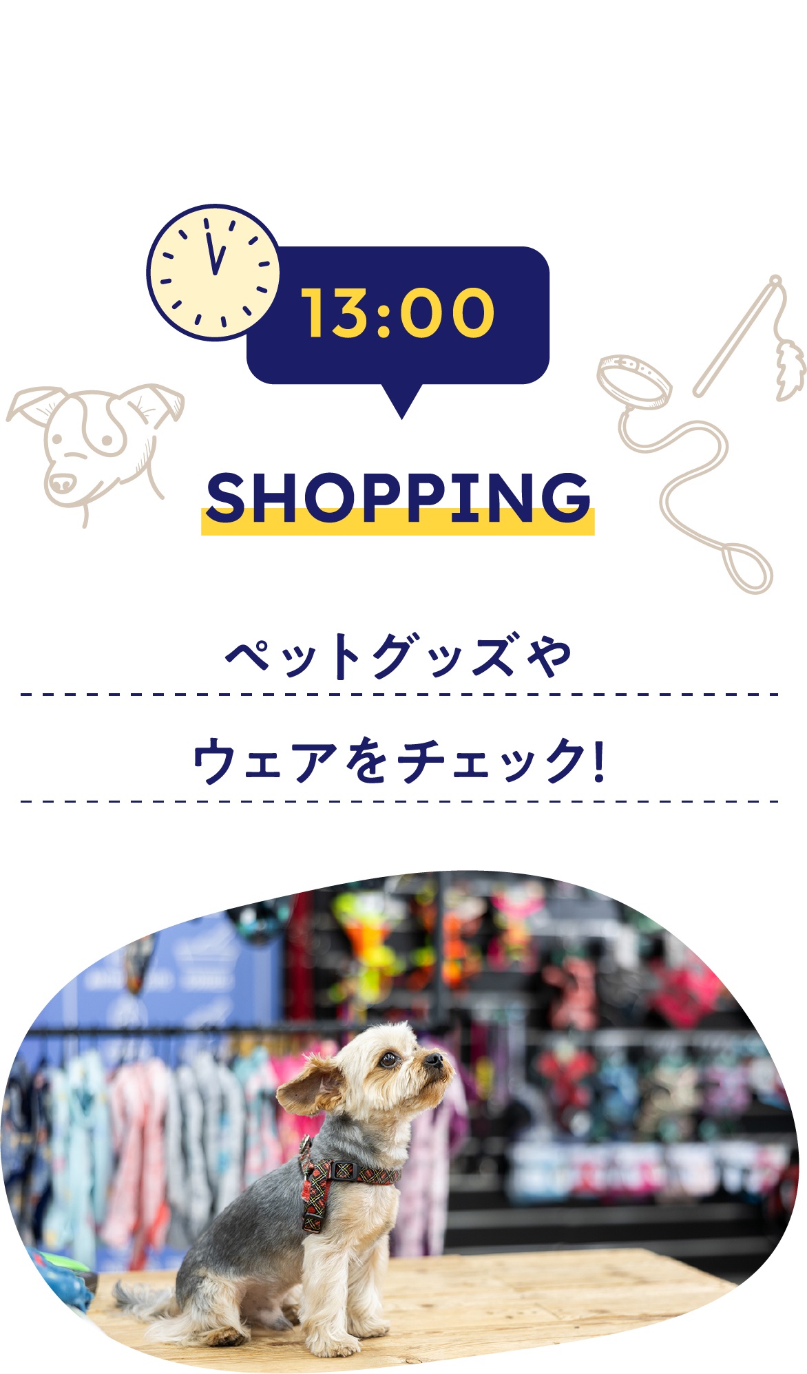 You'll get excited looking at the many clothes and goods, wondering, "Will these look good on my dog?" You'll choose fashionable and cute items, such as seasonal clothing, toys, and treats, while imagining the happy look on your beloved dog's face.