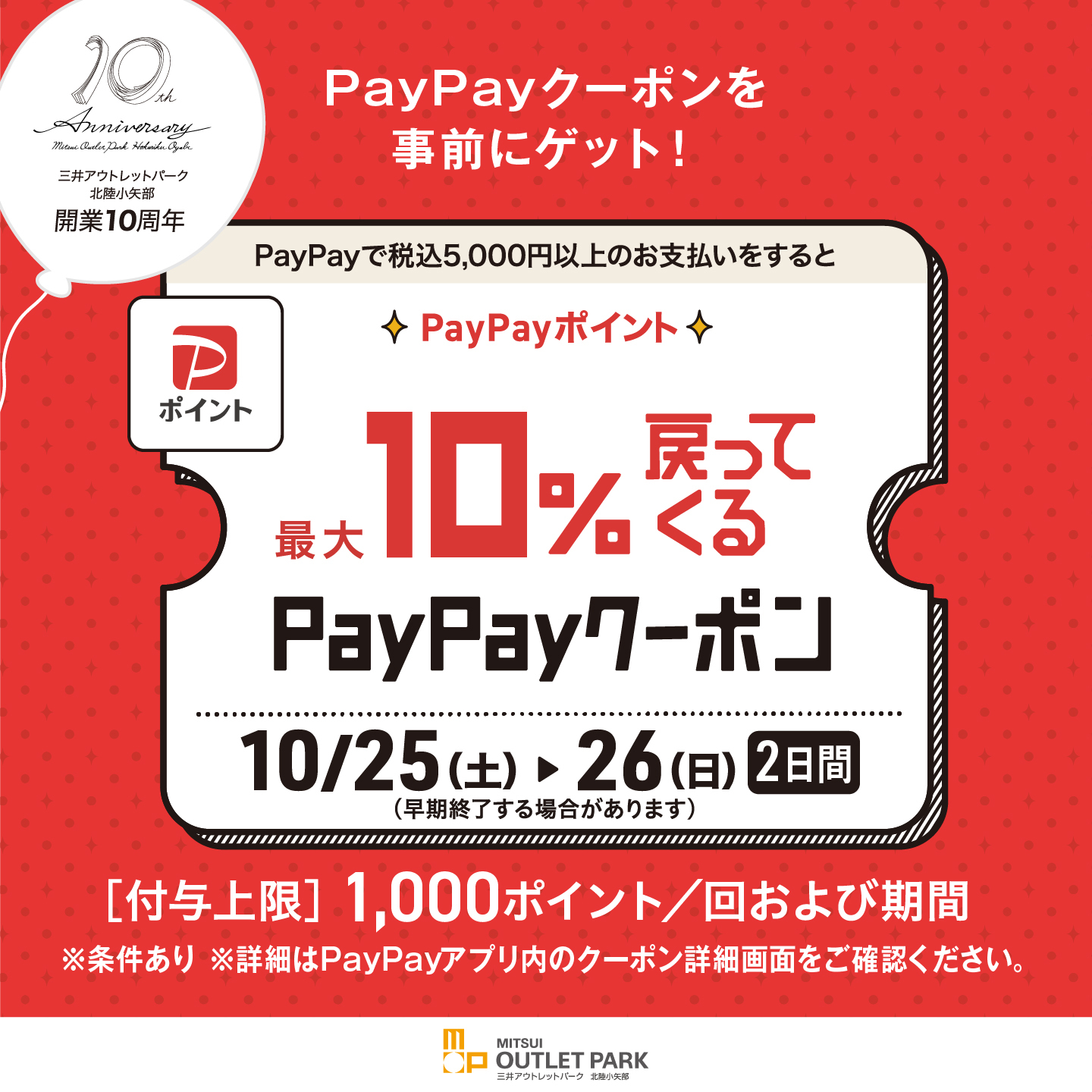 For two days only, on October 25th (Sat) and 26th (Sun), you can earn PayPay points when you spend 5,000 yen or more (tax included) with PayPay. up to 10% Get a coupon back!