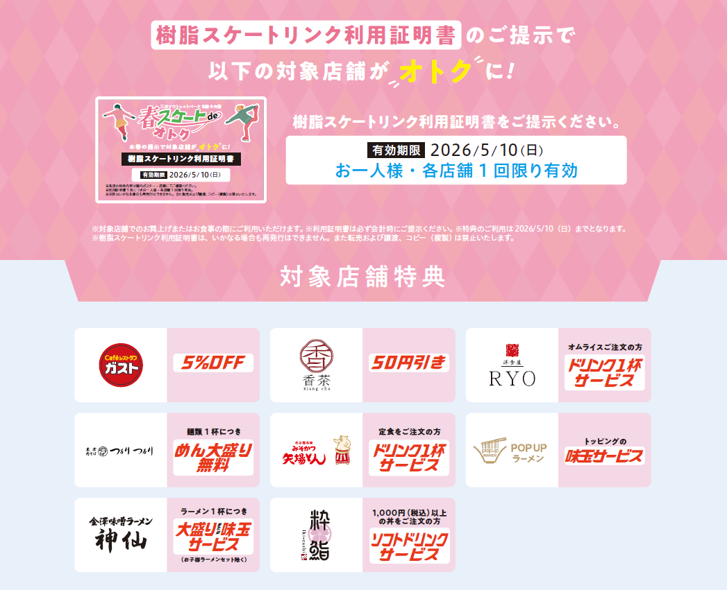 ■Contents: You will receive a "Certificate of Use" when you use the ice rink. Present this "Certificate of Use" at participating stores to receive special benefits.