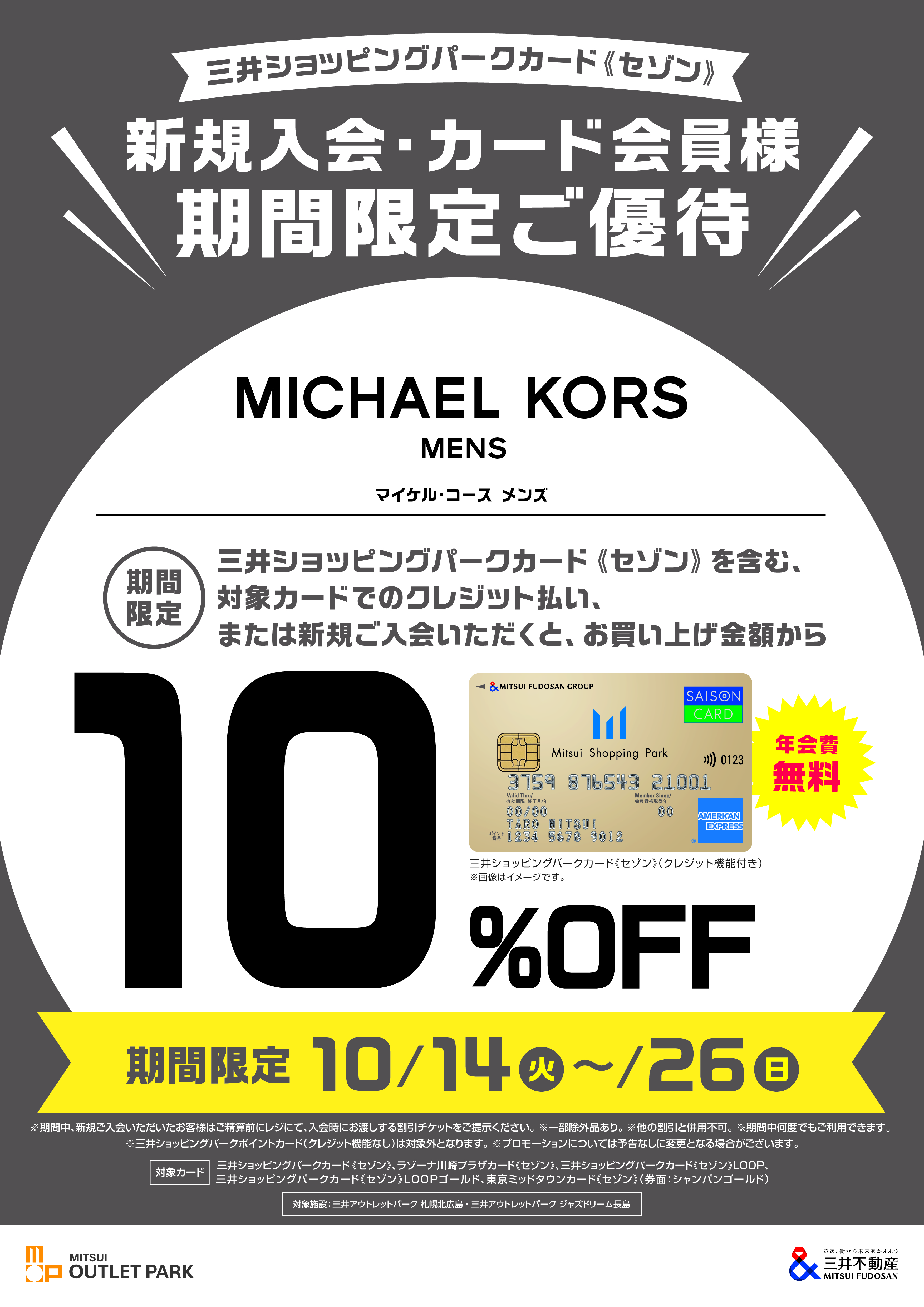 - [MICHAEL KORS MENS Exclusive] Limited-time benefits for Mitsui Shopping Park Card (Saison)!
