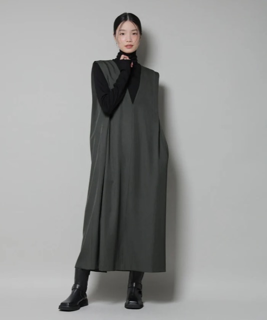This simple jumper skirt features a striking tuck at the shoulders. The deep V-neck design gives it a sophisticated and mature look. You can enjoy a wide range of combinations depending on the inner and outer layers you wear!