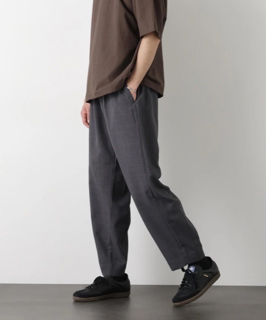 These slacks are part of nano·universe 's summer staple, the "Lightweight Dry Series." Unlike the plain, solid-colored image, these slacks feature a distinctive heathered look reminiscent of worsted wool. Made from a material that dries quickly and is wrinkle-resistant, these slacks are perfect for spring and summer.