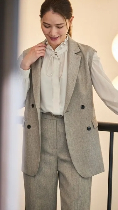 It can be worn as a set or as a single item, expanding the range of coordination options. The textured fabric gives it an updated, elegant look for autumn!