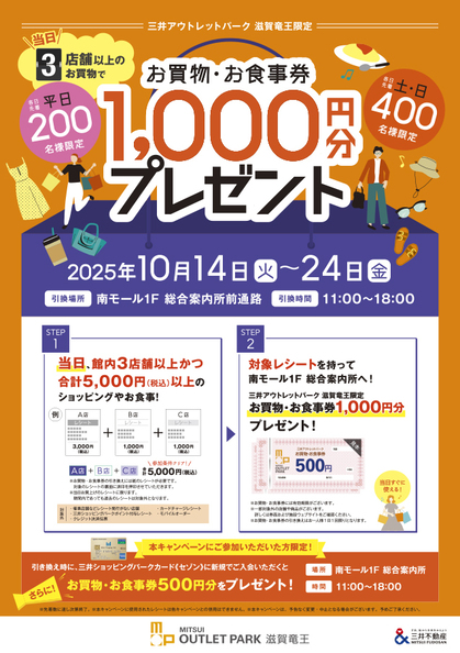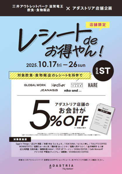 [Adastria × Food & Beverage Stores] "Get a Great Deal with Your Receipt" Campaign! [Limited to MITSUI OUTLET PARK SHIGA RYUO]