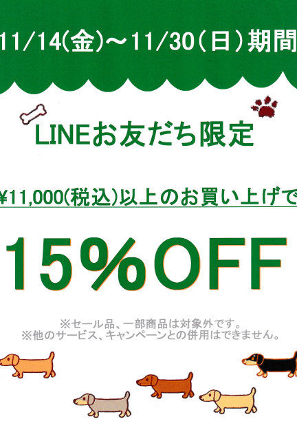 LINEお友だち限定!11,000円(税込)以上で15%OFF!