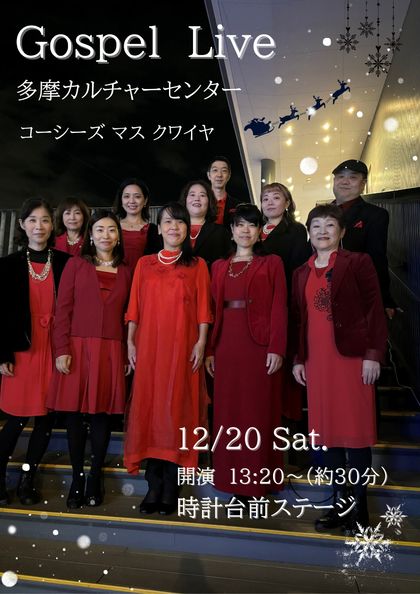 A gospel live performance by gospel instructors and students from Tama Culture Center, section 262 on the second floor of the Villa building, will be held on the stage in front of the clock tower! Please come and enjoy winter gospel music♪ *The event will be cancelled in the event of rain.