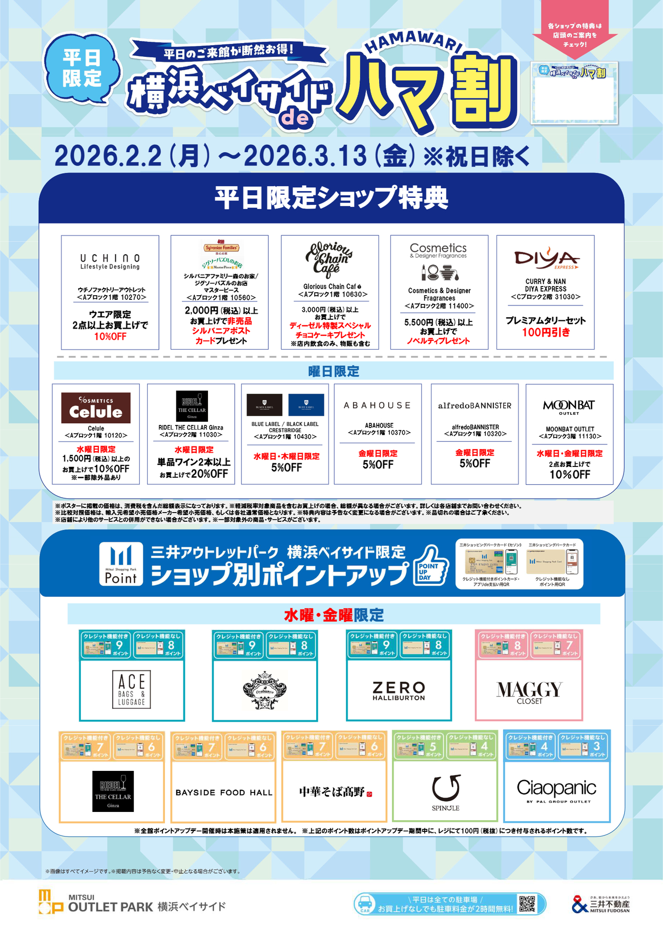 [Weekdays only] YOKOHAMA BAYSIDE Hama Discount! Shops benefits & Shops specific point bonuses