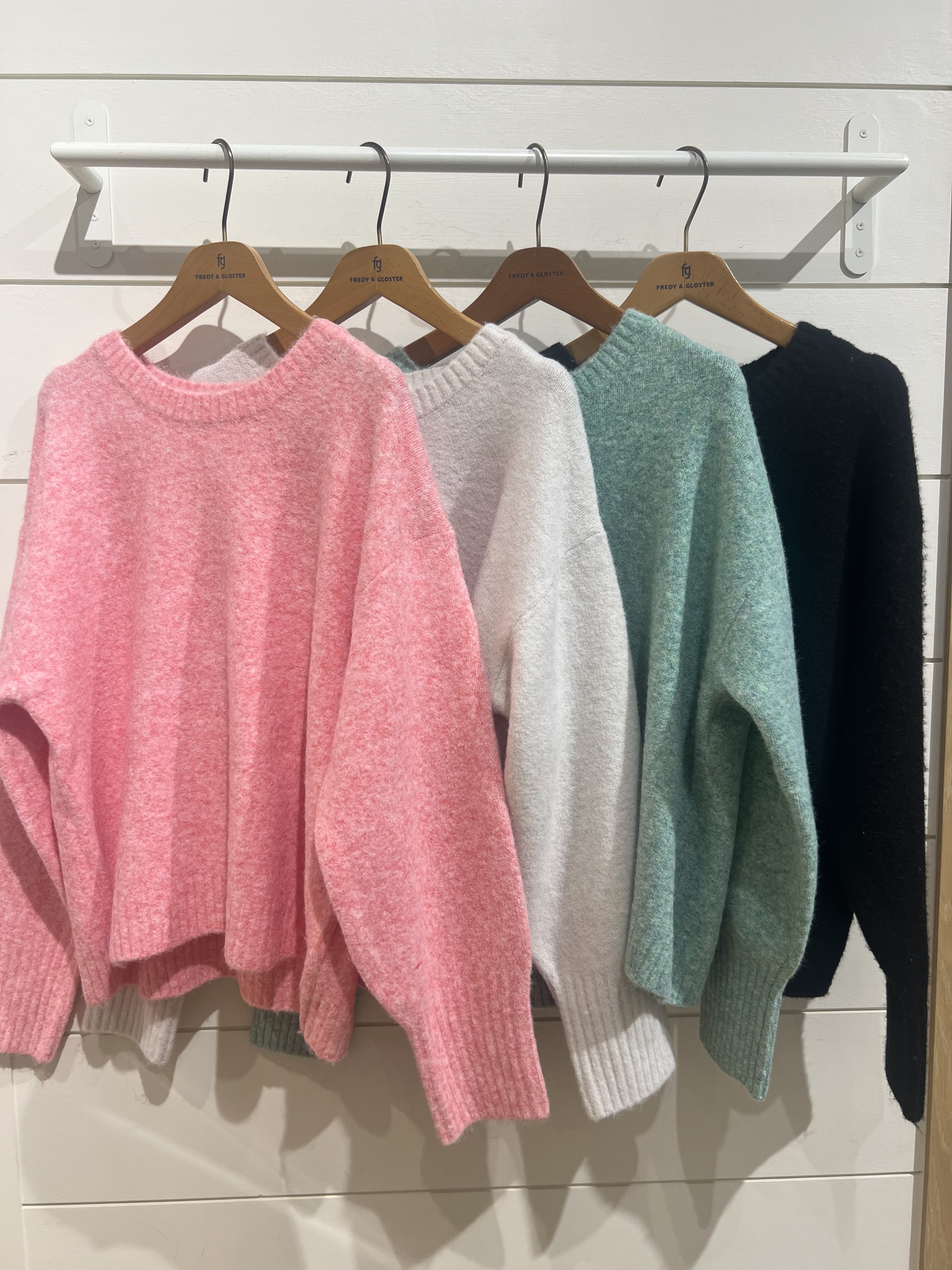 A crew neck pullover with a soft, fluffy fox-like texture.
