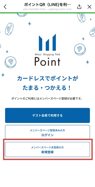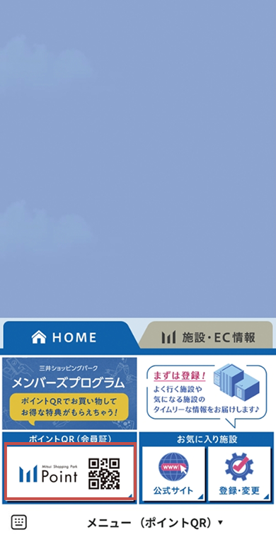 三井ショッピングパークポイントカード、ラゾーナ川崎プラザポイントカード、三井のすまいLOOPメンバーズカード、東京ミッドタウンカード、三井ショッピングパークアプリ・三井ショッピングパークポイントLINE公式アカウント・メンバーズページ・施設ウェブサイト(ポイント用QR)