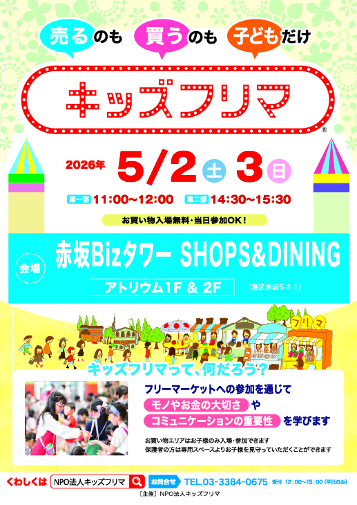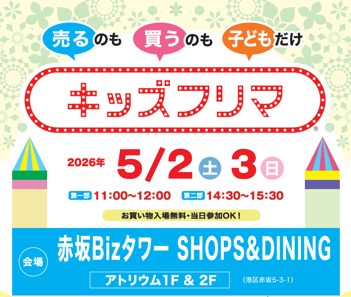 Akasaka Biz Tower SHOPS & DINING will be hosting a "Kids Flea Market" from May 2nd (Sat) to 3rd (Sun)!