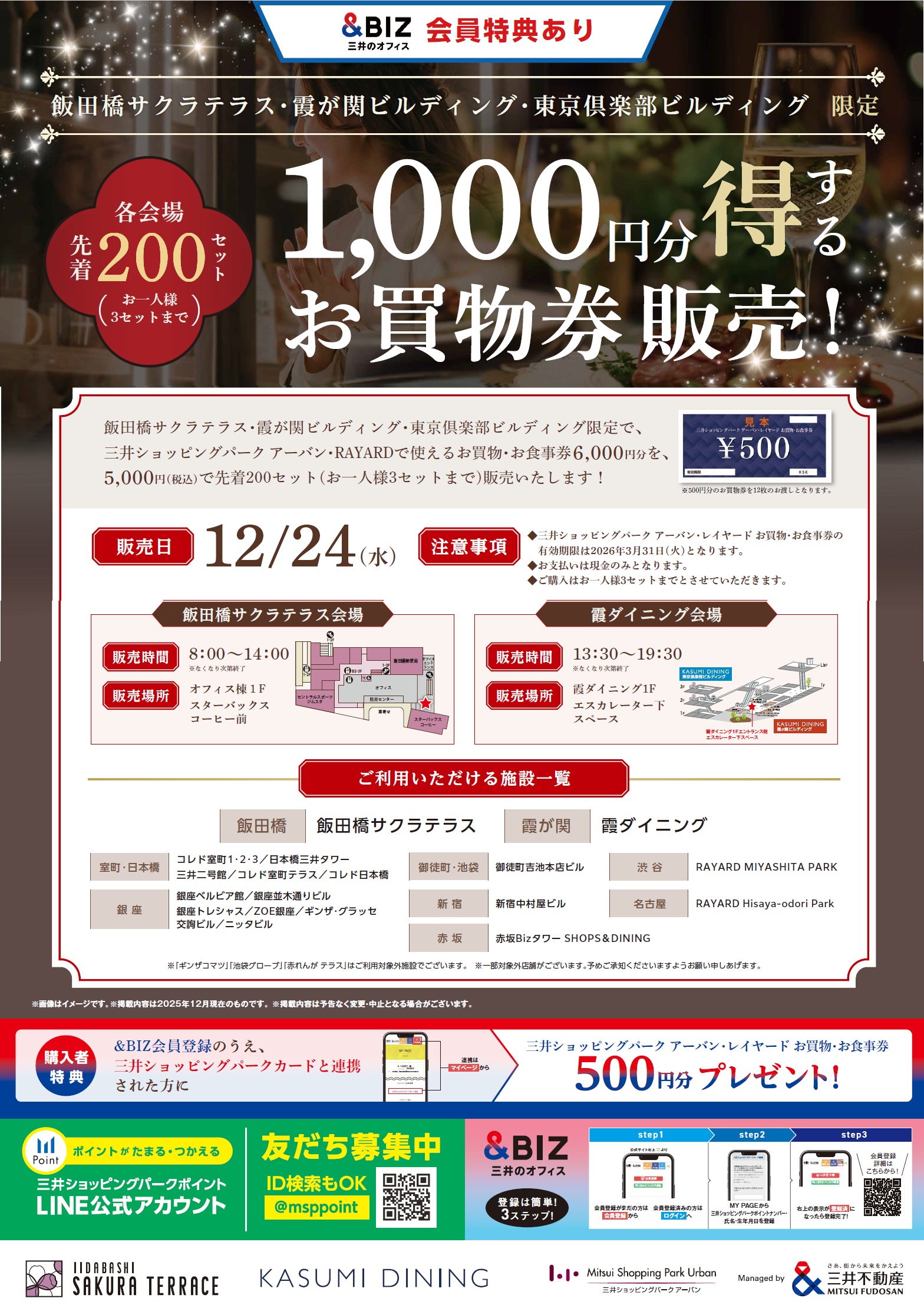 Exclusively for those who work in Iidabashi Sakura Terrace, Kasumigaseki Building, or Tokyo Club Building, we are offering a 6,000 yen shopping and dining voucher that can be used at Mitsui Shopping Park Urban or RAYARD.
