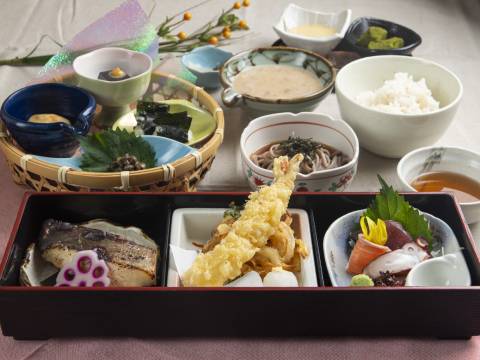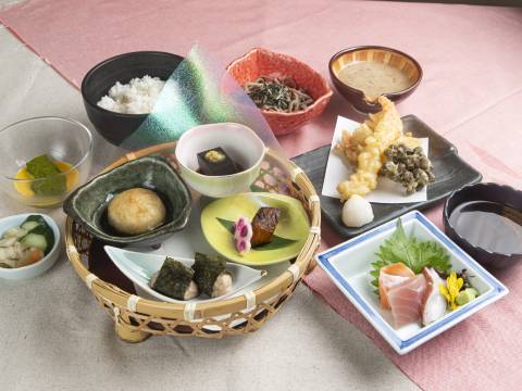 『華花人気NO.1メニュー』自然薯料理はもちろん、お刺身・天ぷら・信州そば・名物デザート付きで、目でも楽しい華やかな御膳です