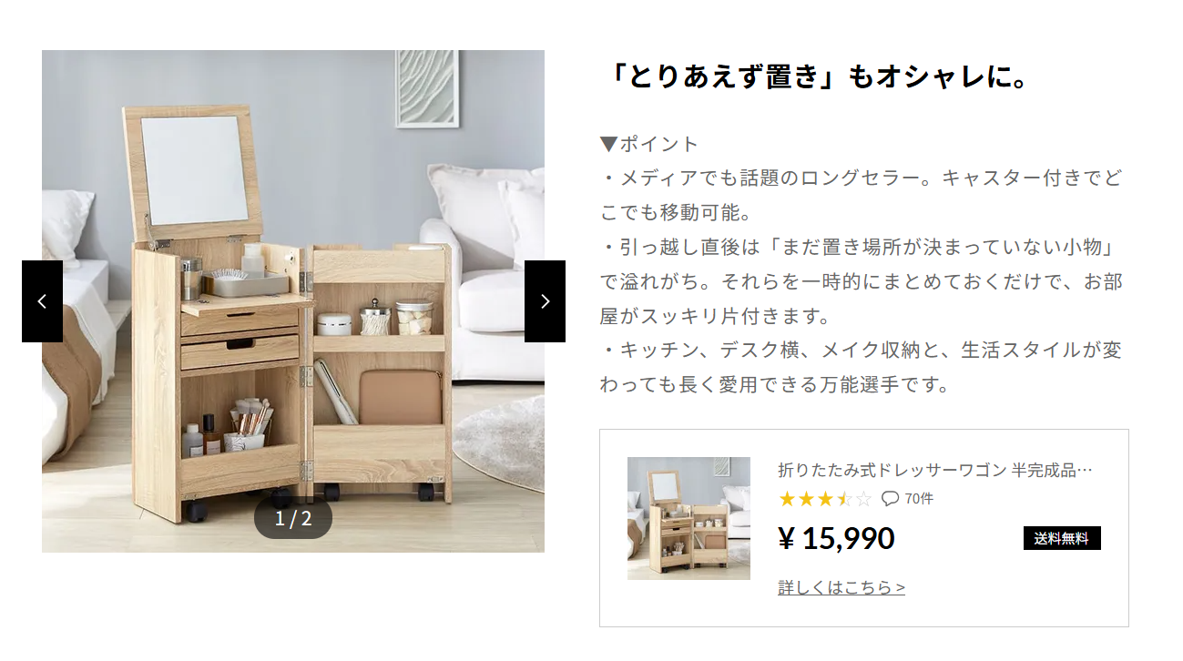 이사 직후에는 물건이 흩어지기 쉽다. 드레서 왜건 (사진 2장째)나, 1대 2역의 드레서 테이블 있다면 좁은 방에서도 생활감을 숨기고 깨끗이! 「내놓지 않고」를 만들지 않는 것이, 미공간을 유지하는 요령입니다.