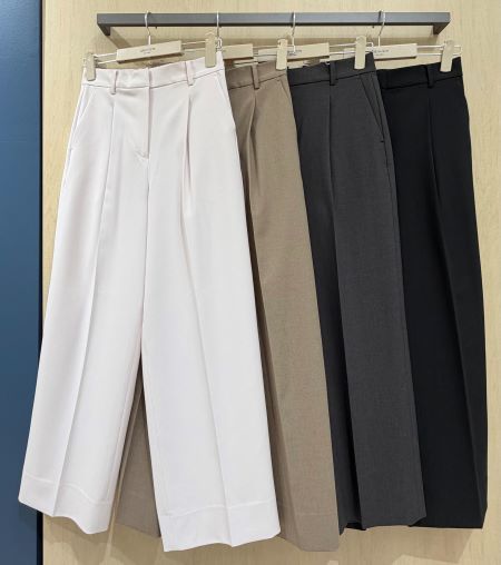 탁 들어가 와이드 팬츠의 디자인으로, 다리가 길게 보이는 조건의 silhouette 입니다.