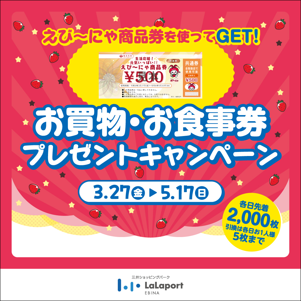 교환 기간중, 수매 영수증과 새우~냐 상품권 이용 증명서를 회장에 가져 주시는 LaLaport EBINA 한정 쇼핑・식사권 500엔분을 선물!