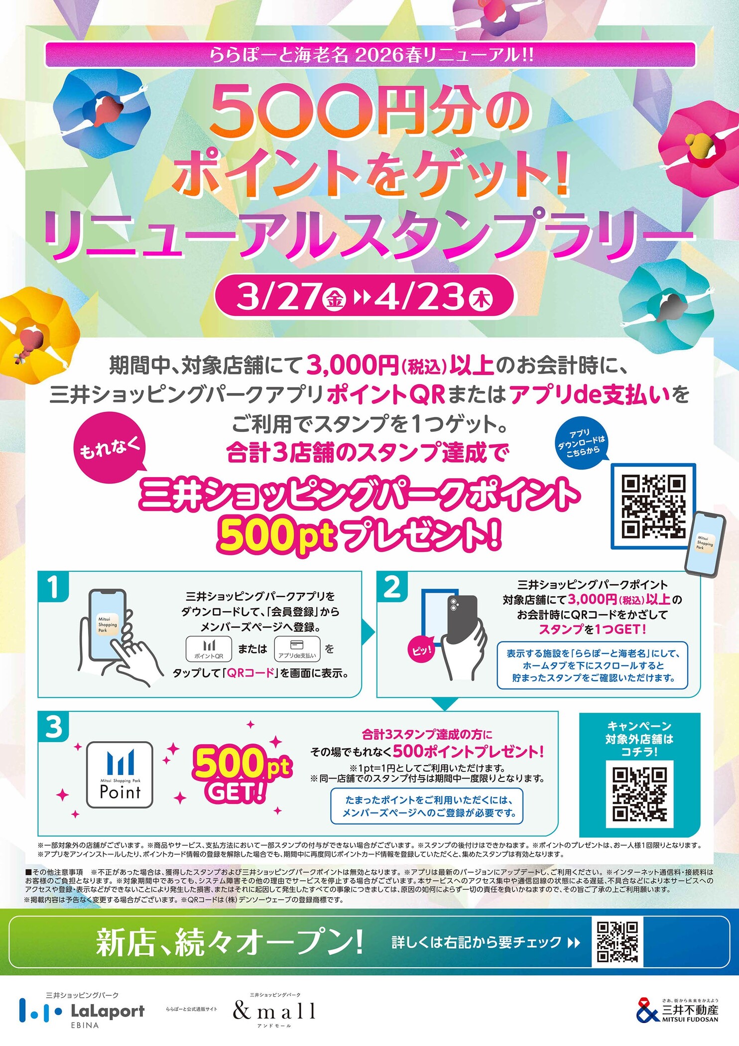 총 3 점포의 스탬프 달성으로, 빠짐없이 미쓰이 쇼핑 파크 포인트 500pt 선물!