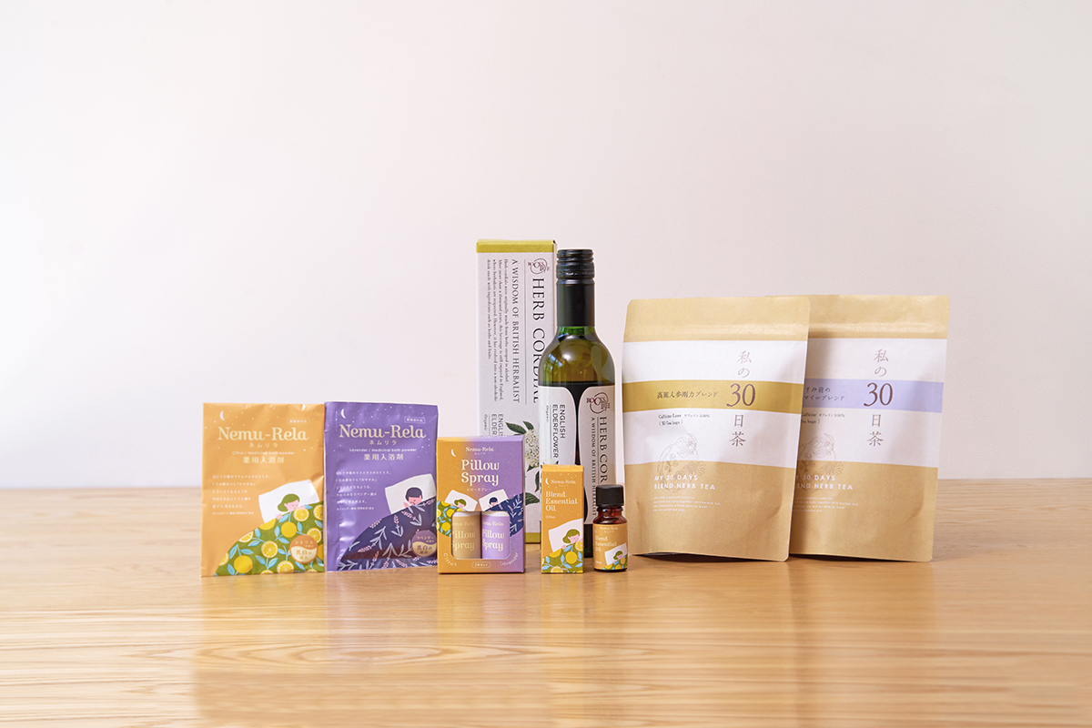수면 환경을 정돈하는 베개용 스프레이, 에센셜 오일, 입욕제나 화한을 사용한 허브 티, 인기의 엘더 플라워 코디얼을 포장했습니다.