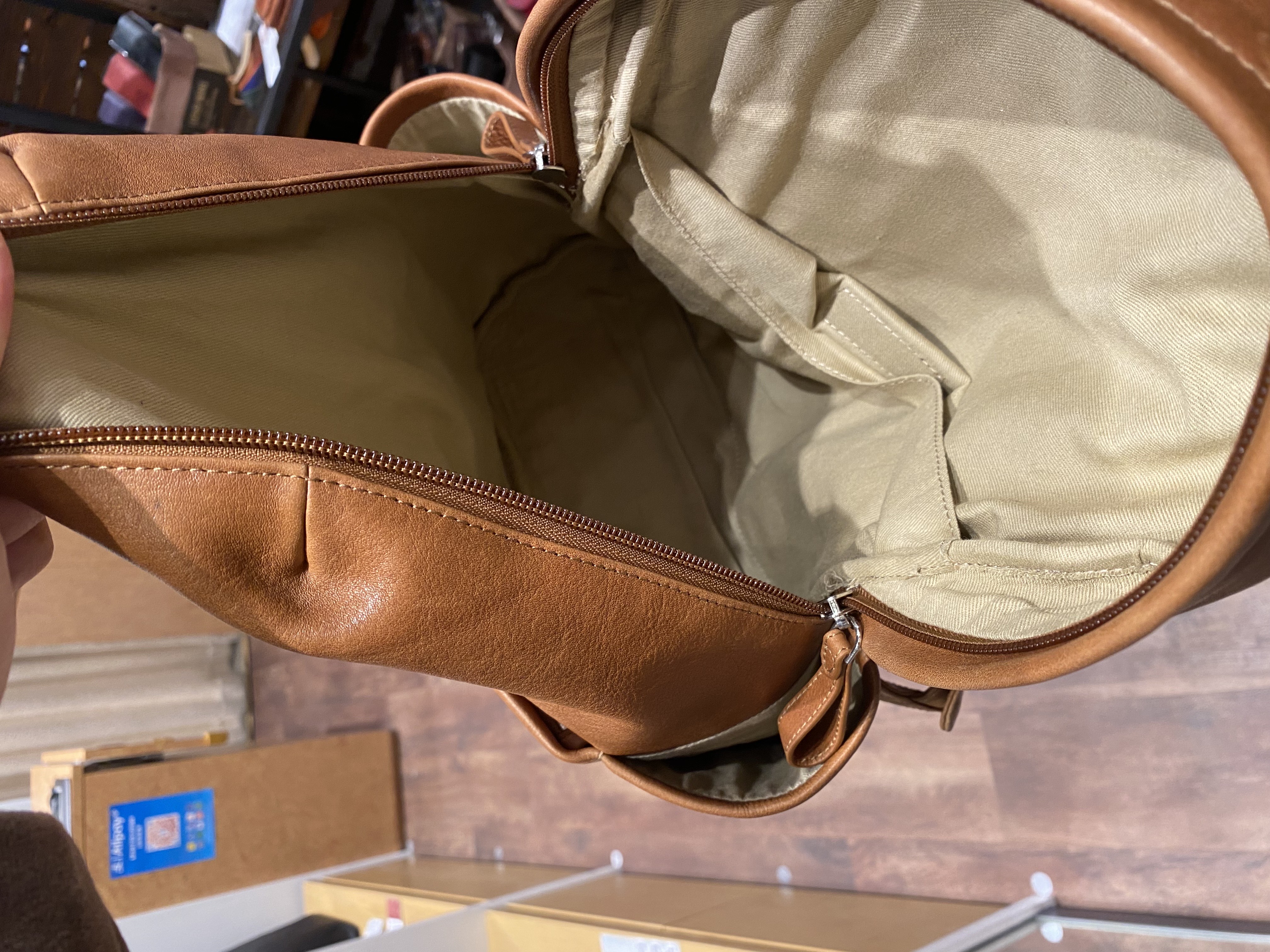 広めのマチでメイン収納の見通しがよく、豊富なアウトポケットでスマホやカードケースなどへ素早くアクセスできます。レザーは肩や背中にやさしく馴染み、
