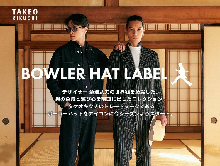 TAKEO KIKUCHI의 트레이드 마크인 볼러 모자 워커를 아이콘으로 이번 시즌부터 시작합니다.