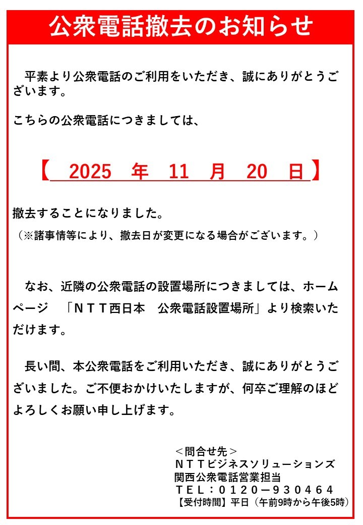 또한, 인근의 공중 전화의 설치 장소에 대해서는, 홈 페이지 「NTT 서일본 공중 전화 설치 장소」에서 검색하실 수 있습니다.