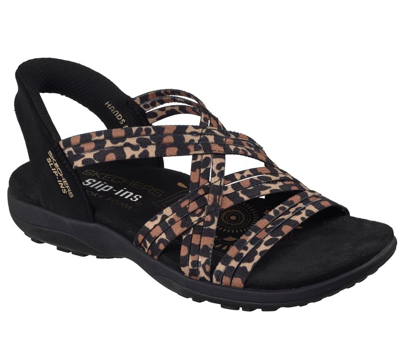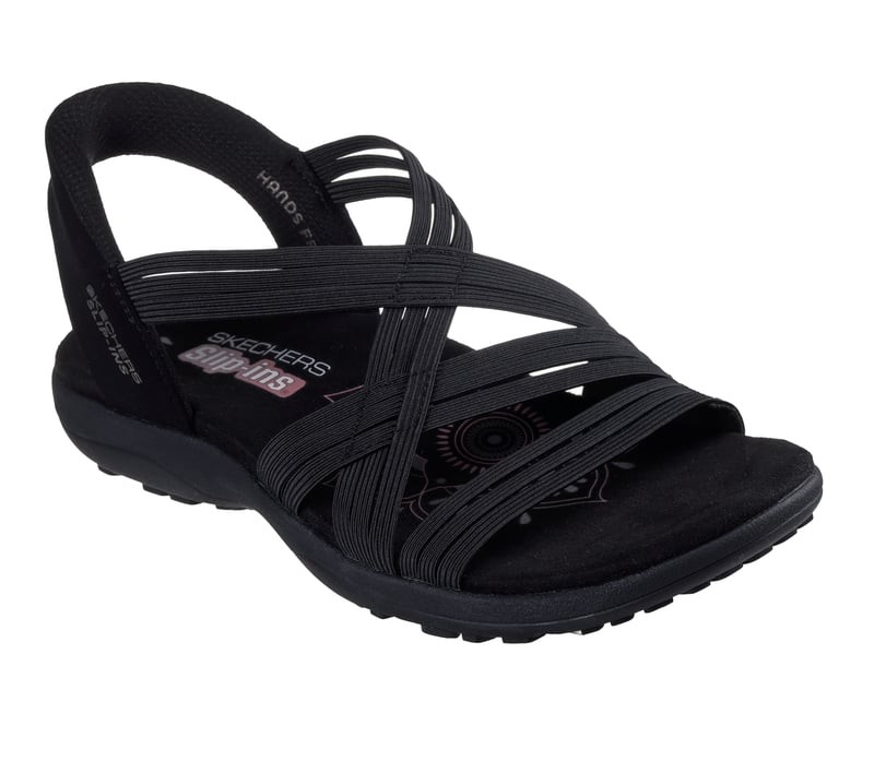 Skechers Hands Free Slip-ins®(SKECHERS 쳐즈 핸즈프리 슬립인즈)의 백힐을 갖춘 슬립온 Stretch Fit™(스트레치 피트) 샌들. 스트래피 고어 어퍼, 스케쳐스 메모리 폼™(SKECHERS 메모리 폼) 풋베드가 특징입니다.
