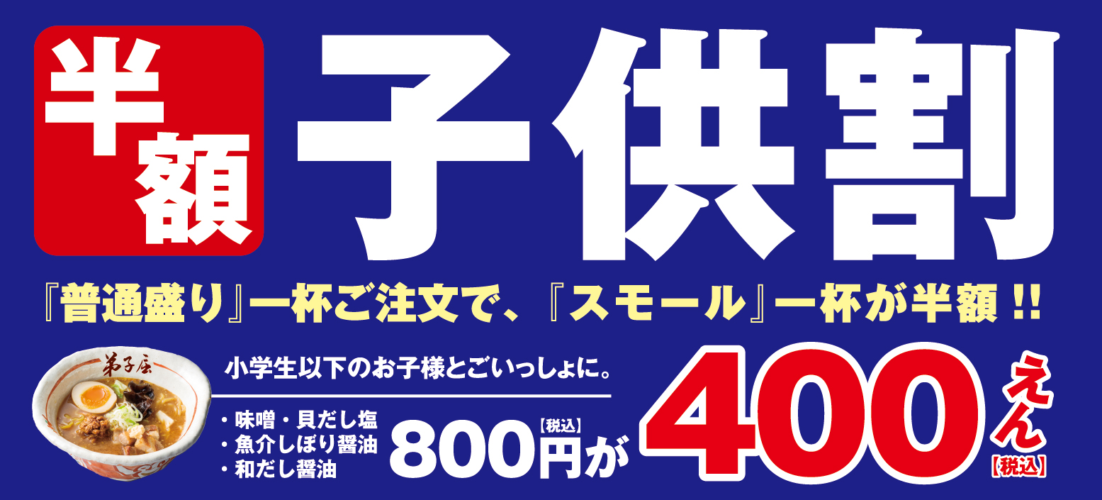 레귤러 라면(대성가)을 주문으로, 초등학생 이하의 어린이분의 스몰 라면이 반액(세금 포함 400엔)입니다.