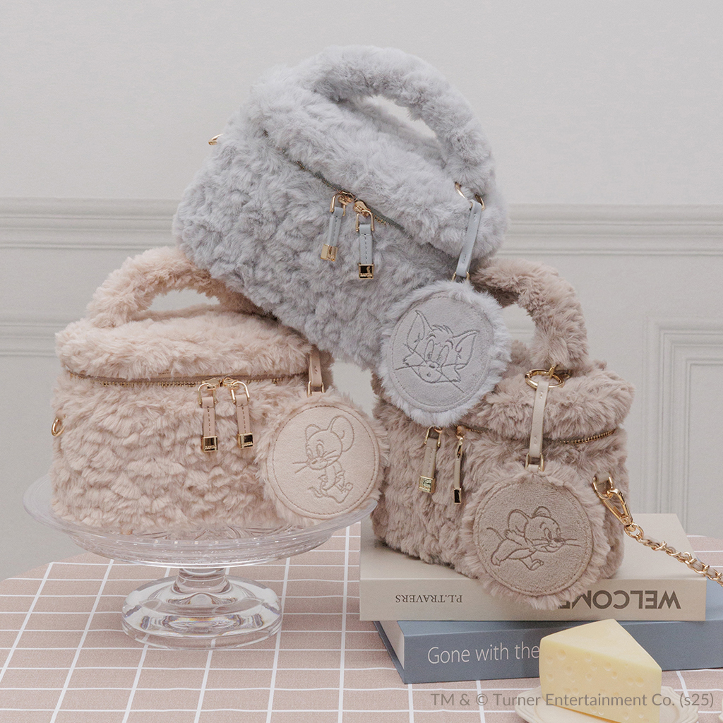 톰은 그레이, 제리는 베이지, 태피는 핑크 모모모 이 퍼로 표현한 바니티백. 부속의 미러에는 각각의 자수를 포인트에 매력 듬뿍 완성했습니다.
