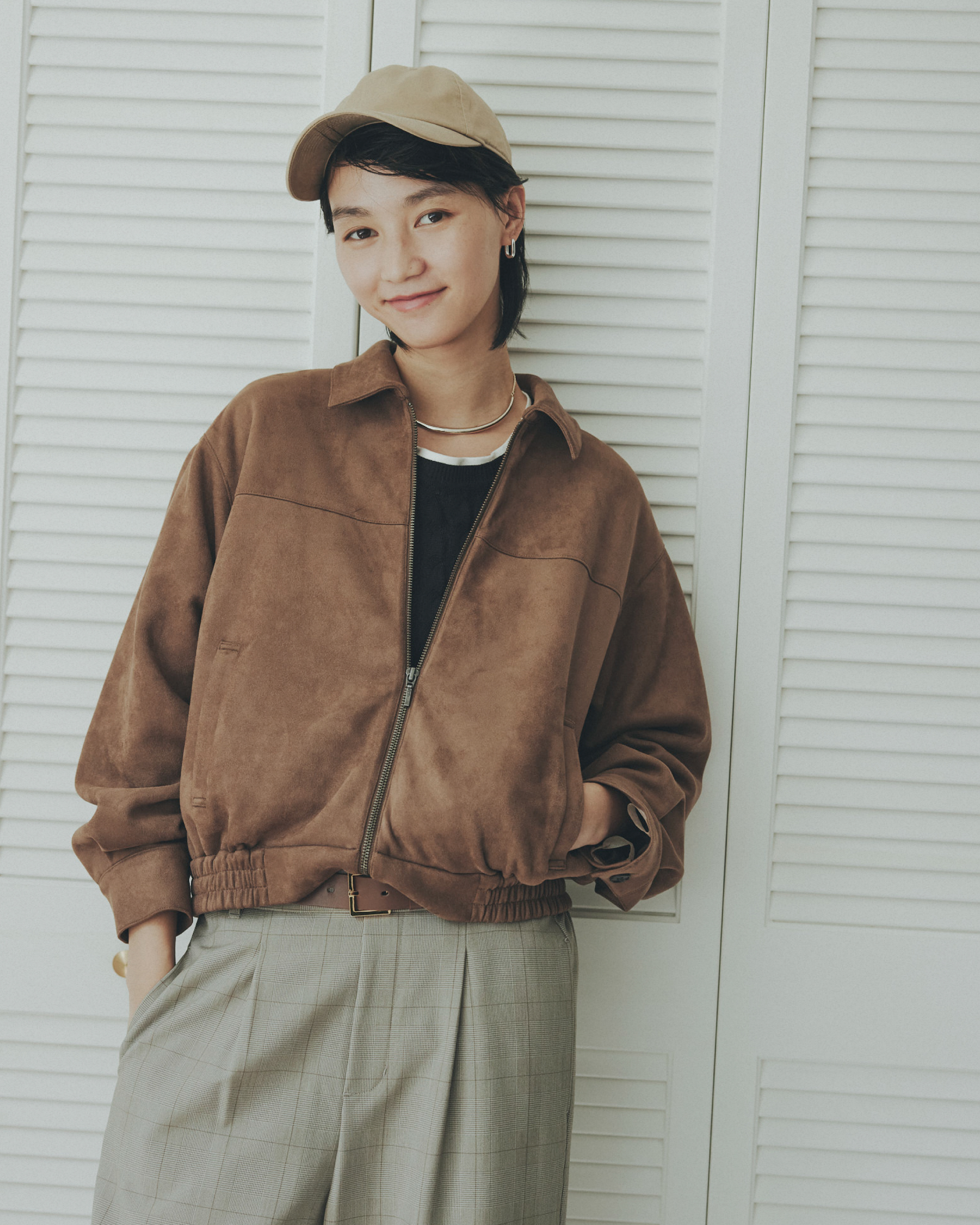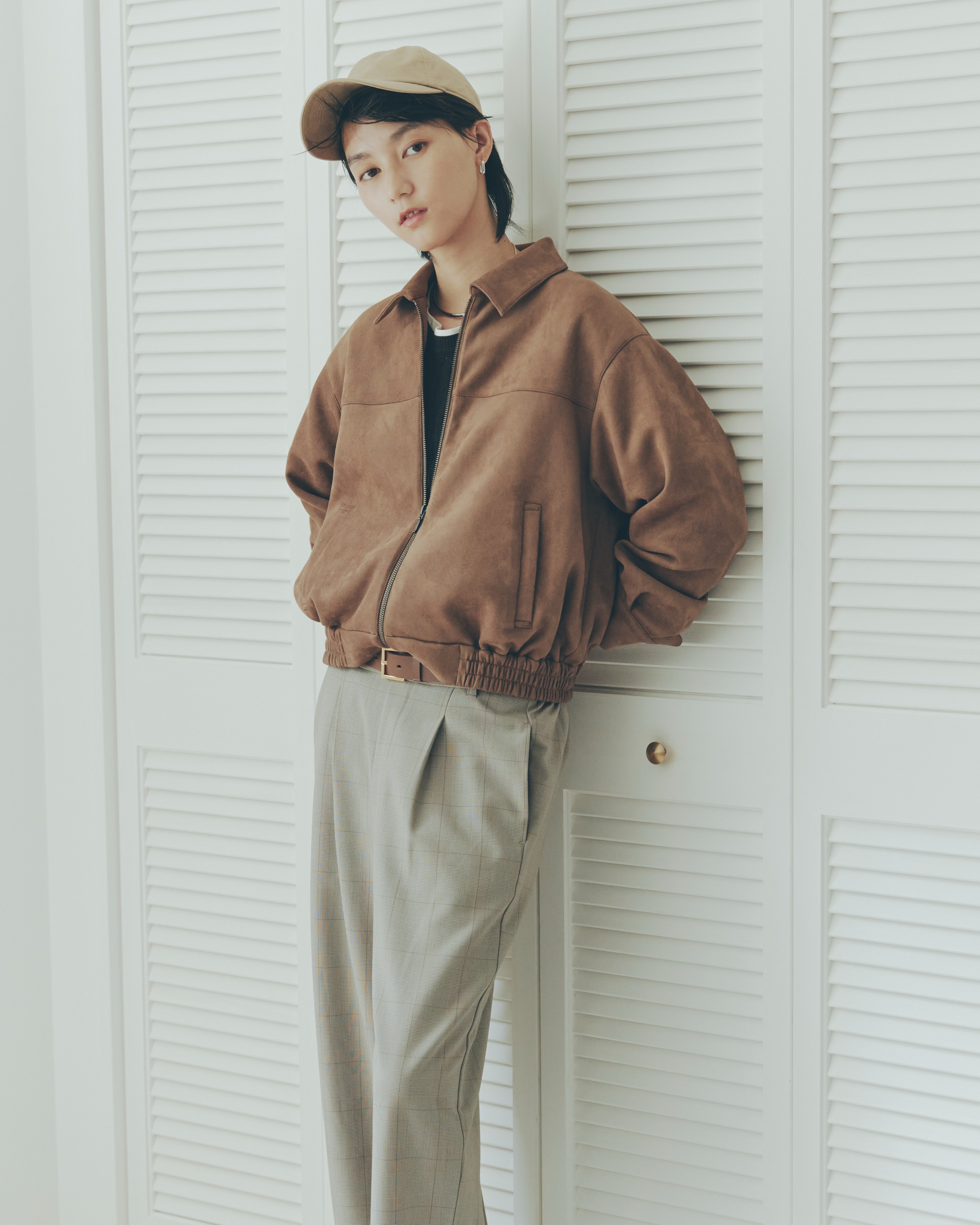가을 분위기 감도는 부드러운 스웨이드 톤 소재.
