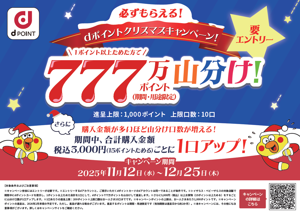 캠페인 기간중 엔트리 위, Toys“R”Us 등 베이비 더 등 각 점포에서의 쇼핑으로, d포인트 카드를 제시(1포인트 이상 버린다) 주시면, 빠짐없이 d포인트 777만 포인트※를 산 나누어 진정❗️