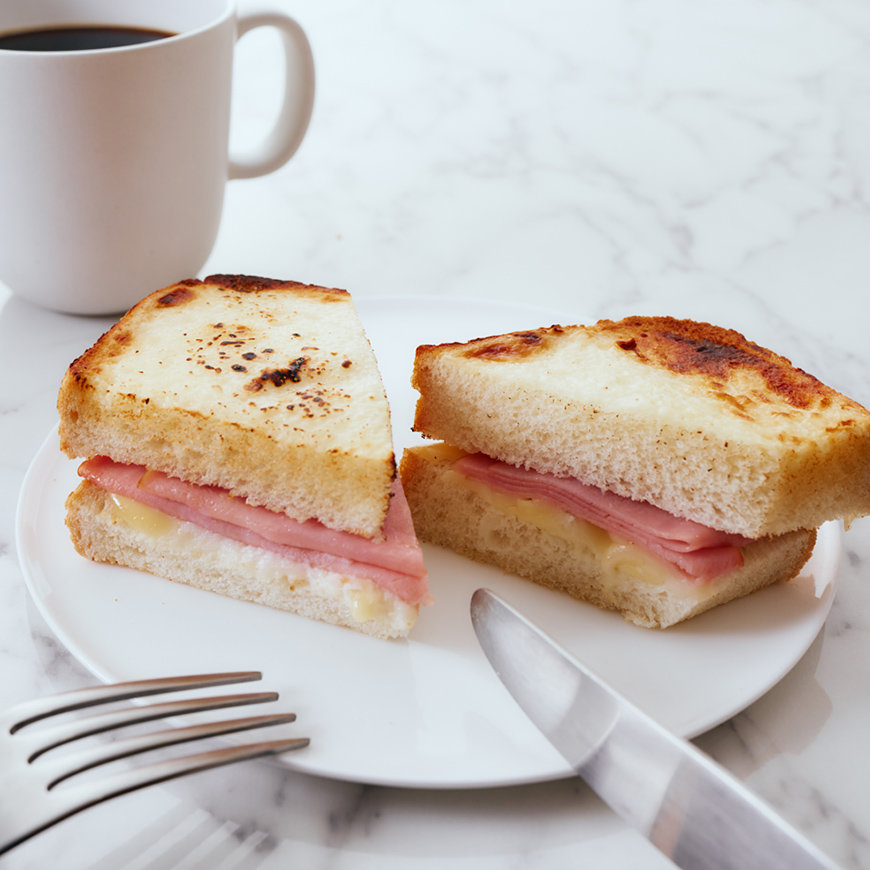 리미한 베샤멜 소스와 치즈와 풍미가 풍부한 로스햄을 끼운 핫샌드입니다. 한 손으로 먹을 수 있기 때문에,