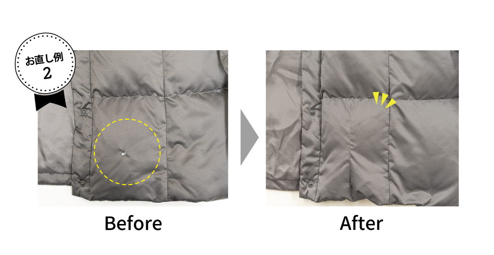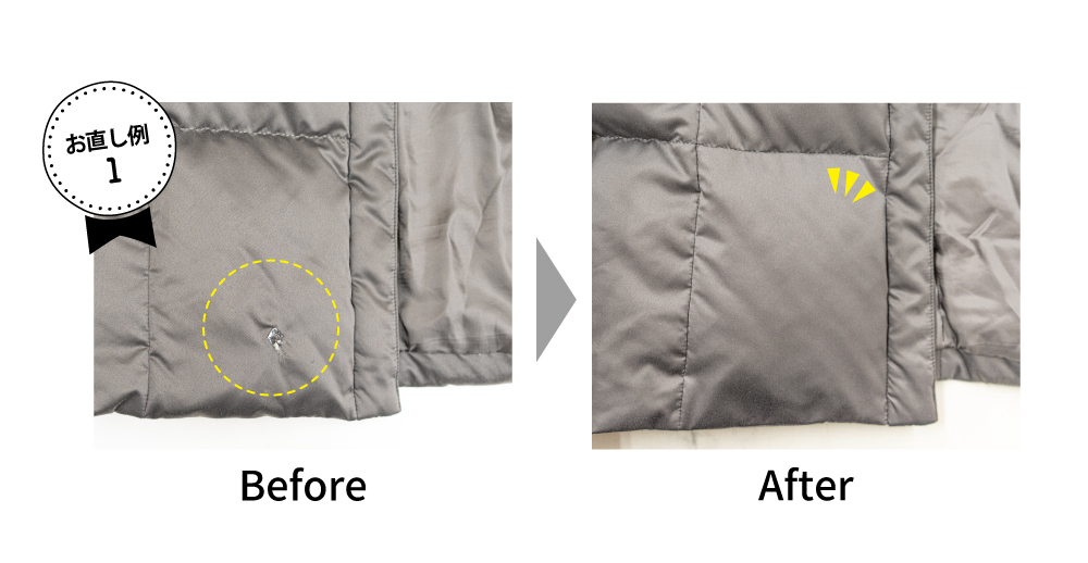 천공 등을 그대로 두면 안에 들어있는 날개가 빠져 보온력도 저하되어 버립니다. 「천공」이나 「야부레」를 발견하면 서둘러 상담해 주십시오.