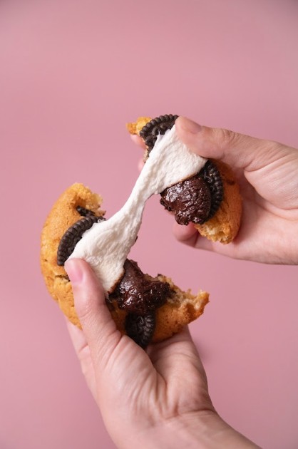 마시멜로와 가나슈 초코, 코코아 쿠키를 겹쳐.