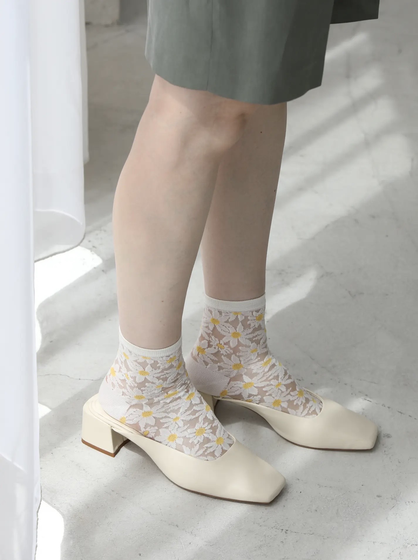 シースルー生地をベースに、大ぶりのマーガレット柄をふんだんにあしらった華やかなシースルーソックスです。