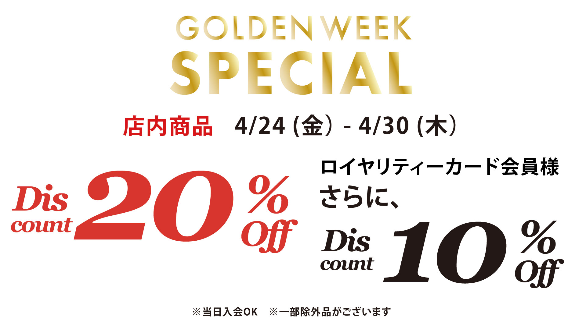 【4th Anniversary! 기간 한정】GOLDEN WEEK SPECIAL 점내 상품 20 % OFF!
