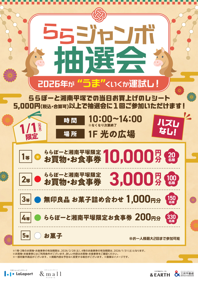 LaLaport SHONAN HIRATSUKA 에서의 당일 매상 영수증 5,000엔(부가세 포함·합산 가능) 이상으로 하즐레 없음! 추첨회에 1회 참가하실 수 있습니다!