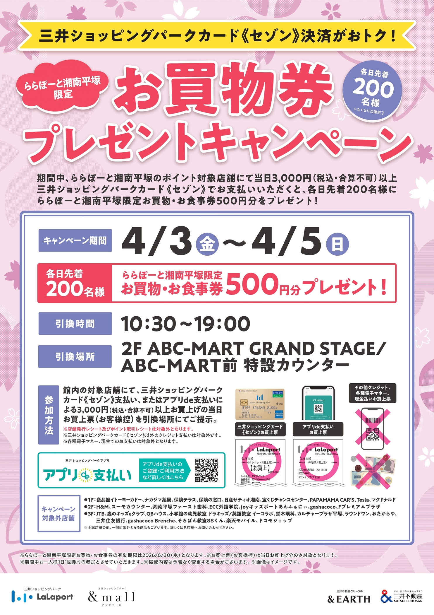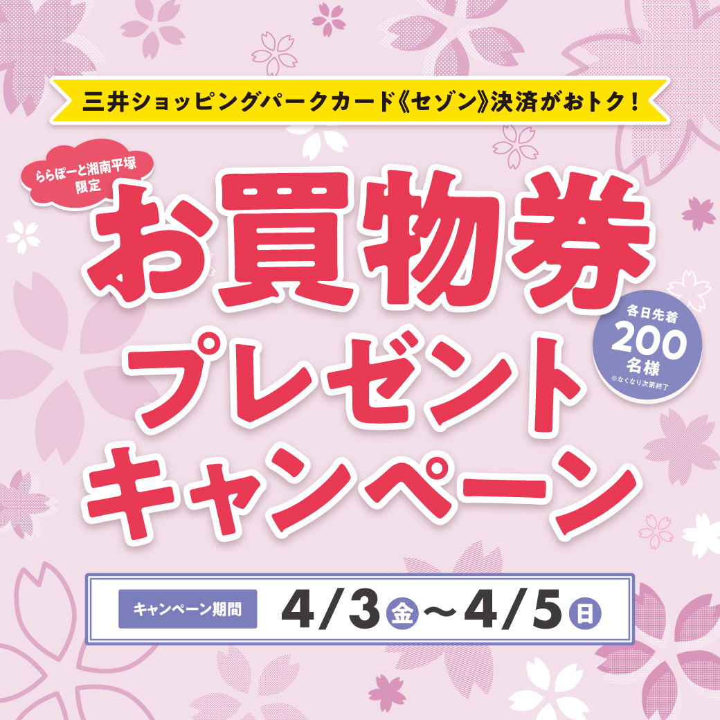 기간 중 LaLaport SHONAN HIRATSUKA의 포인트 대상 점포에서 당일 3,000엔(세금 포함, 합산 불가) 이상 미쓰이 쇼핑 파크 카드 《세존》으로 결제 시, 매일 선착순 200명에게 LaLaport SHONAN HIRATSUKA 한정 쇼핑・식사권 500엔분을 증정합니다!