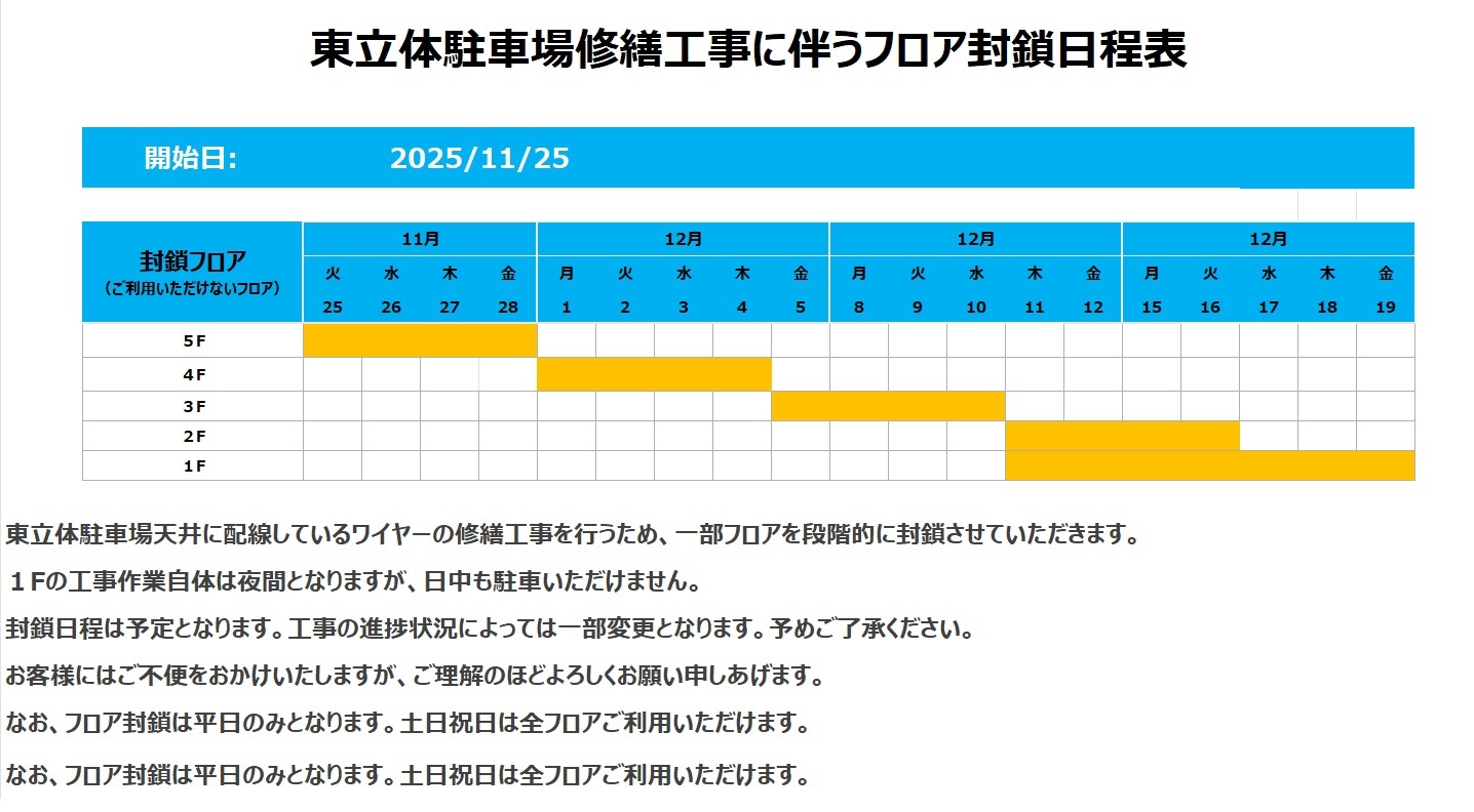 동립체 주차장 내 천장 와이어의 수선 공사에 따라, 동립체 주차장을 플로어마다 이용할 수 없는 기간이 발생합니다.