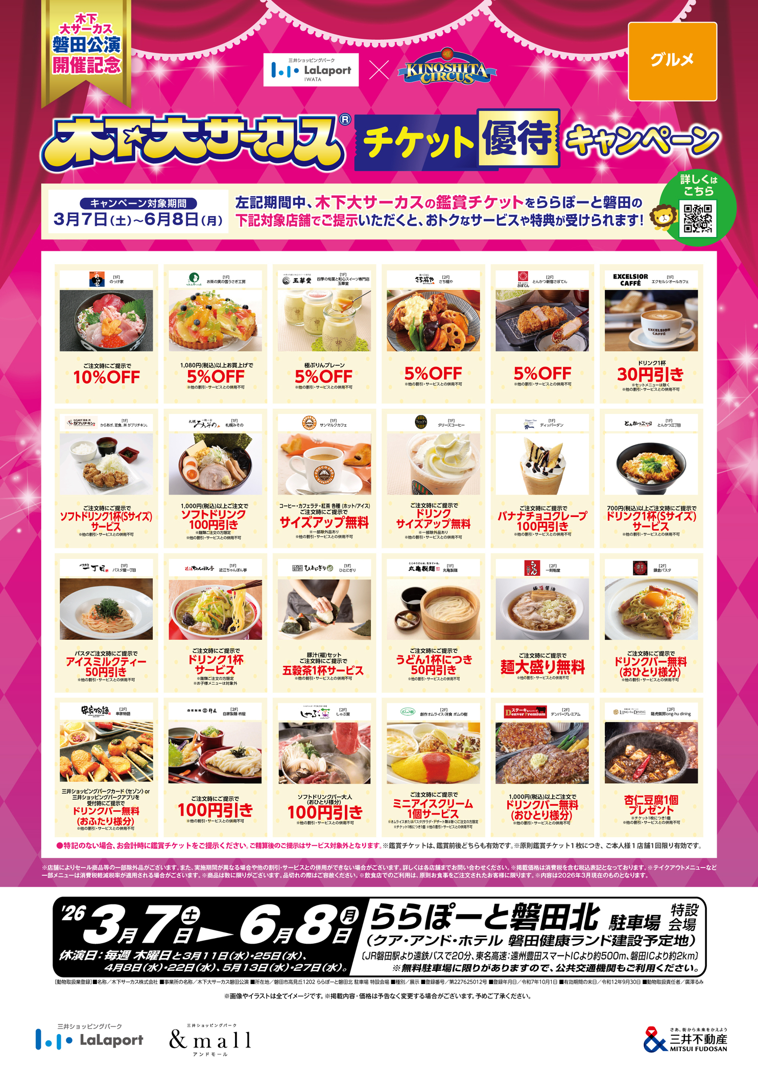 下記期間中、木下大サーカスの鑑賞チケットをららぽーと磐田の対象店舗でご提示いただくと、おトクなサービスや特典が受けられます!
