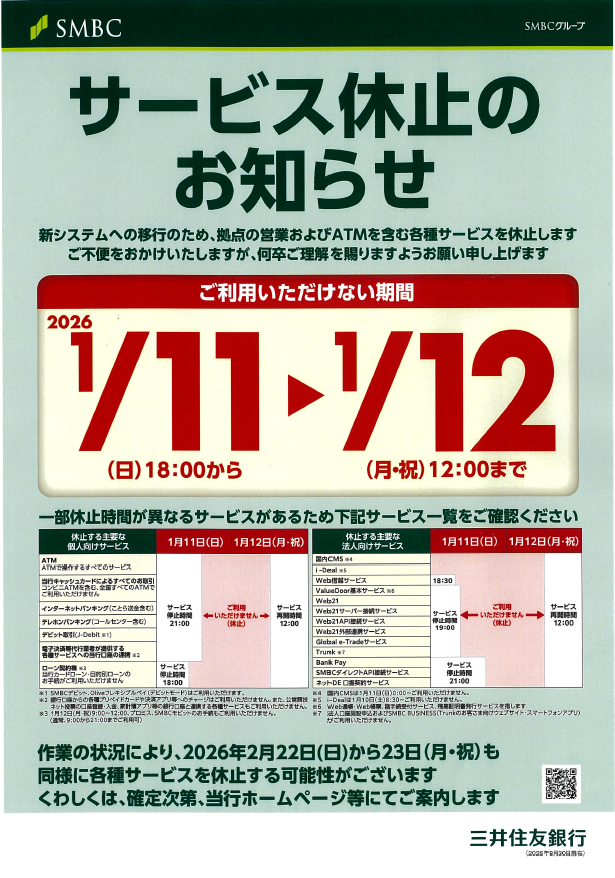 【Sumitomo Mitsui Bank】서비스 휴지 통지