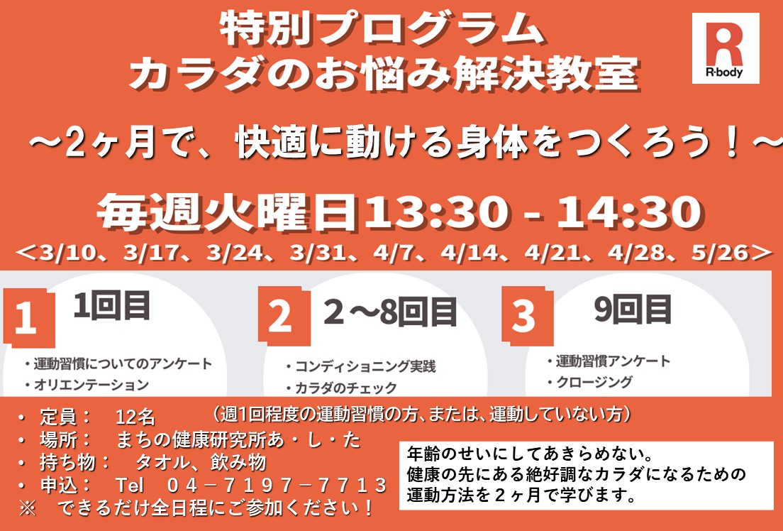 - 【R-body 특별 프로그램】몸의 고민 해결 교실~2개월로 쾌적하게 움직일 수 있는 몸을 만들자! ~(무료)
