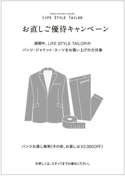 또, LIFE STYLE TAILOR의 팬츠, 재킷, 슈트를 구입하신 분 대상으로 팬츠 수선 무료(그 외, 수선은 ¥2,000 OFF)의 캠페인을 동시 개최합니다.