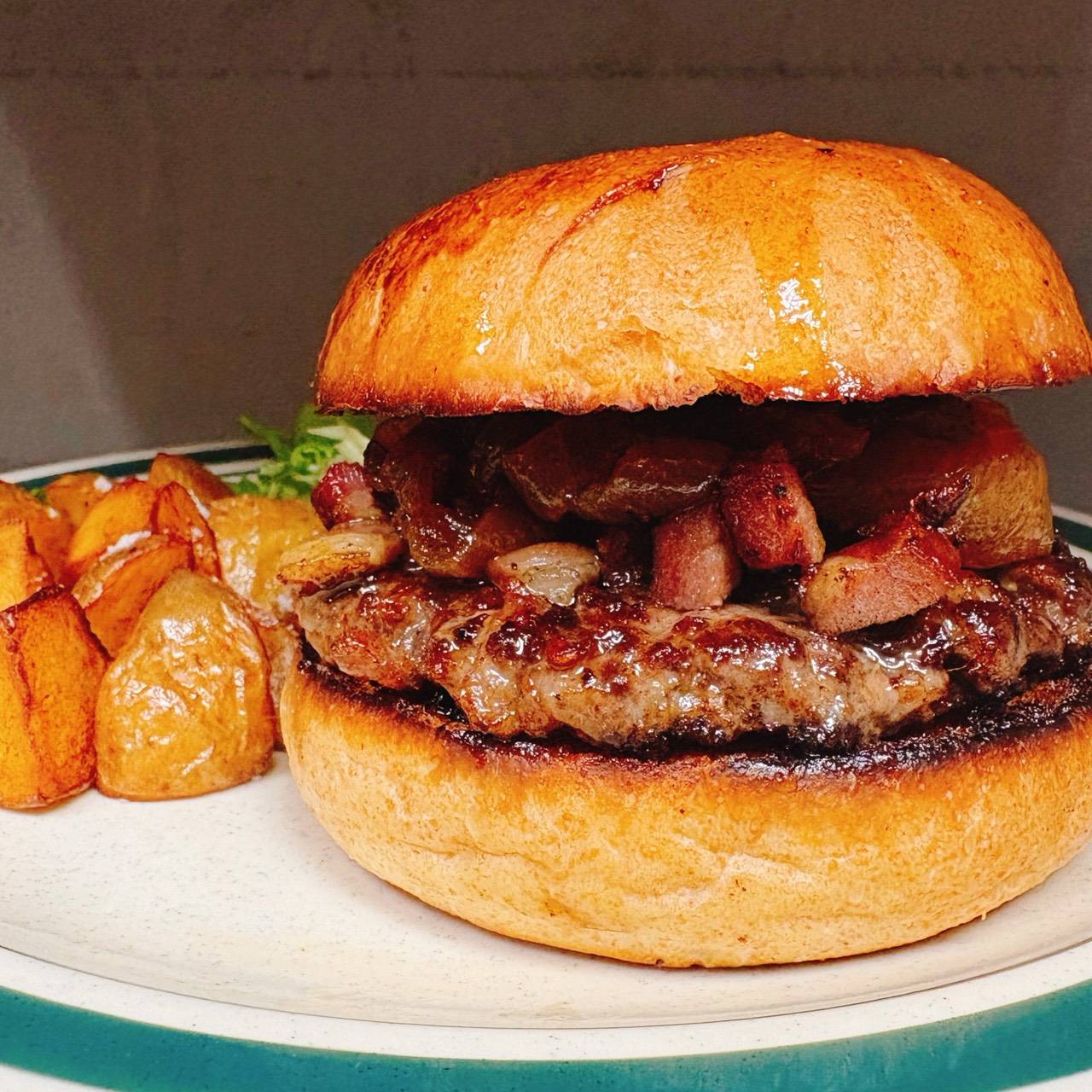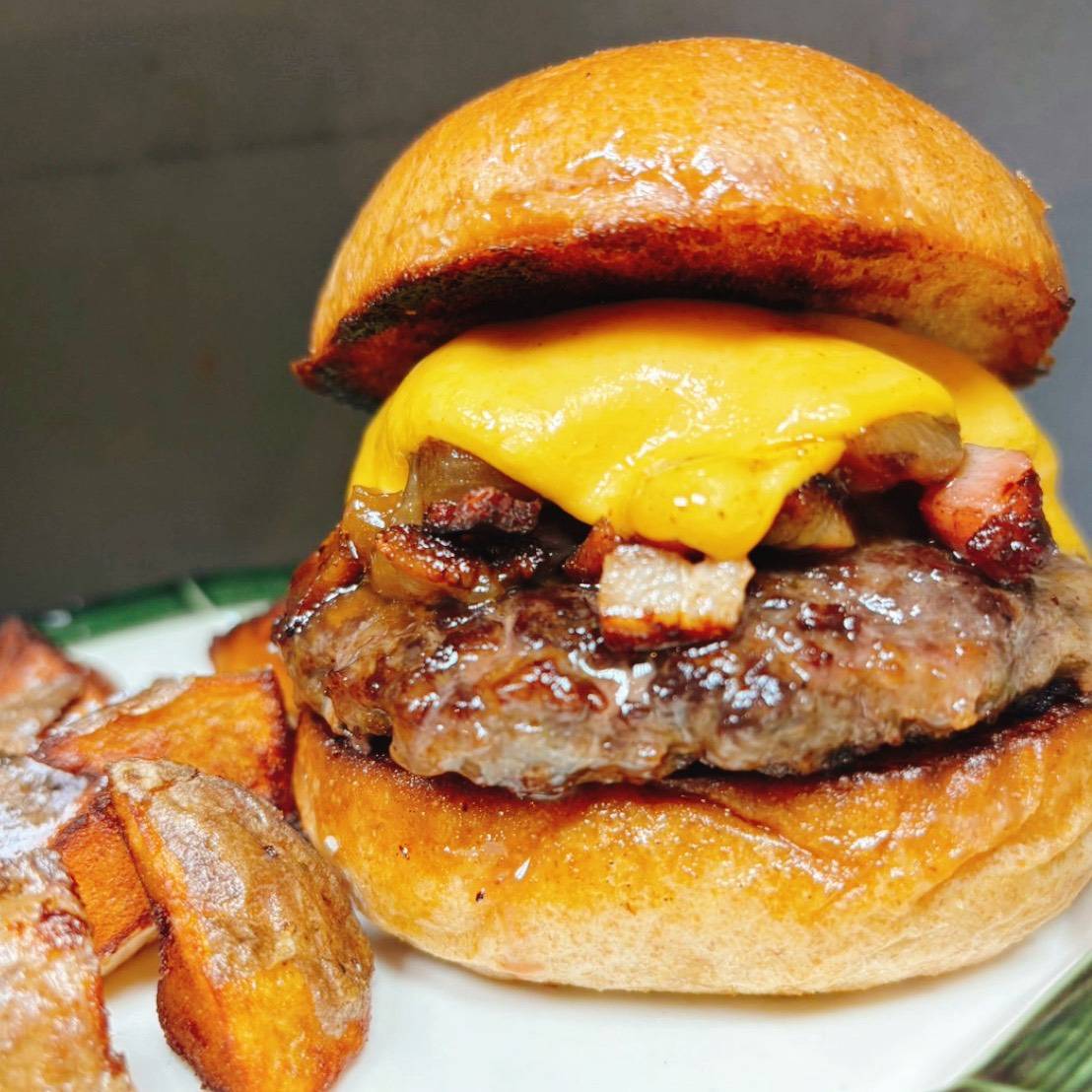 국산 100% 패티를 끌어당기는 데 사용된 세세하게 새겨진 훈제 베이컨이 특징적인 인기 메뉴입니다.
