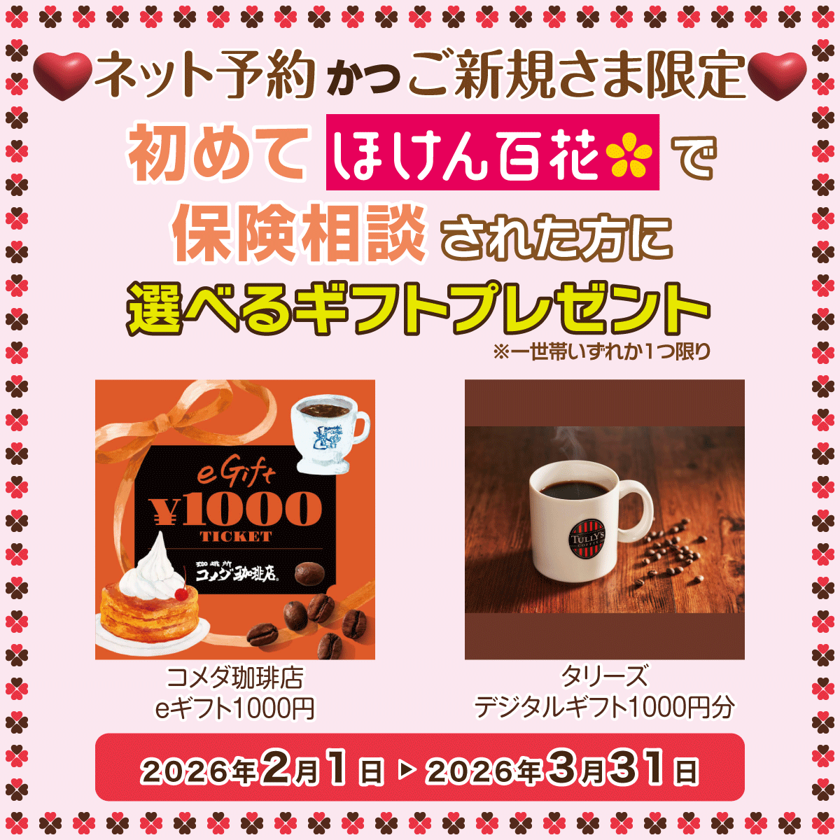 ほけん百花のご利用が初めての方で、キャンペーン期間中にネットでご予約のうえ、保険相談いただいた方に、「選べるギフト(1000円)」をプレゼント。